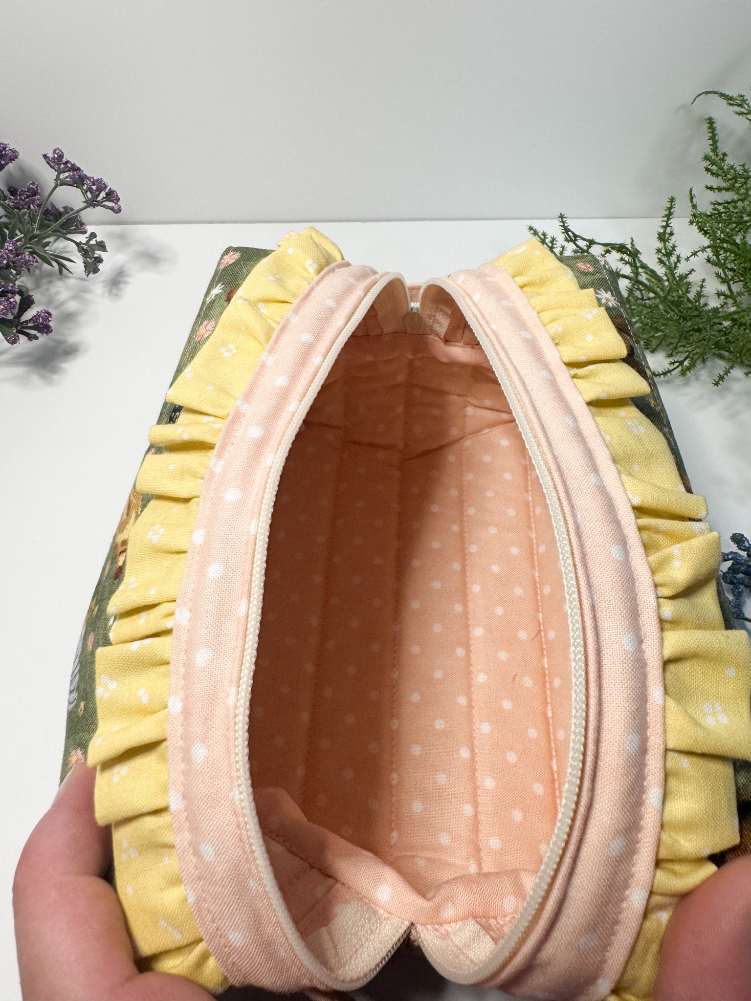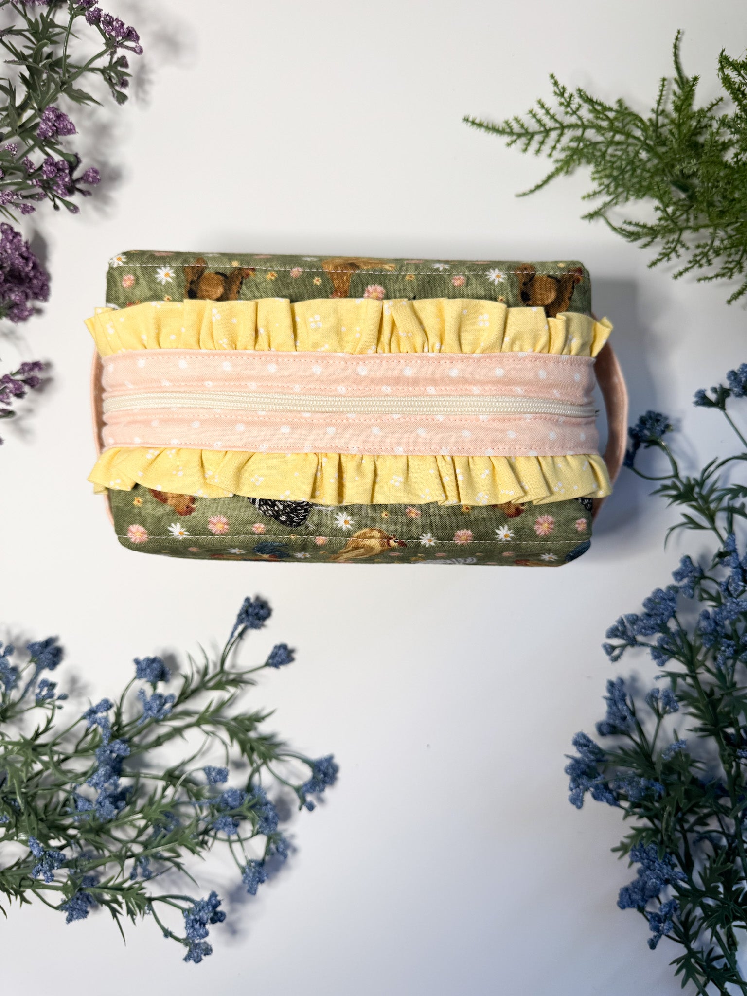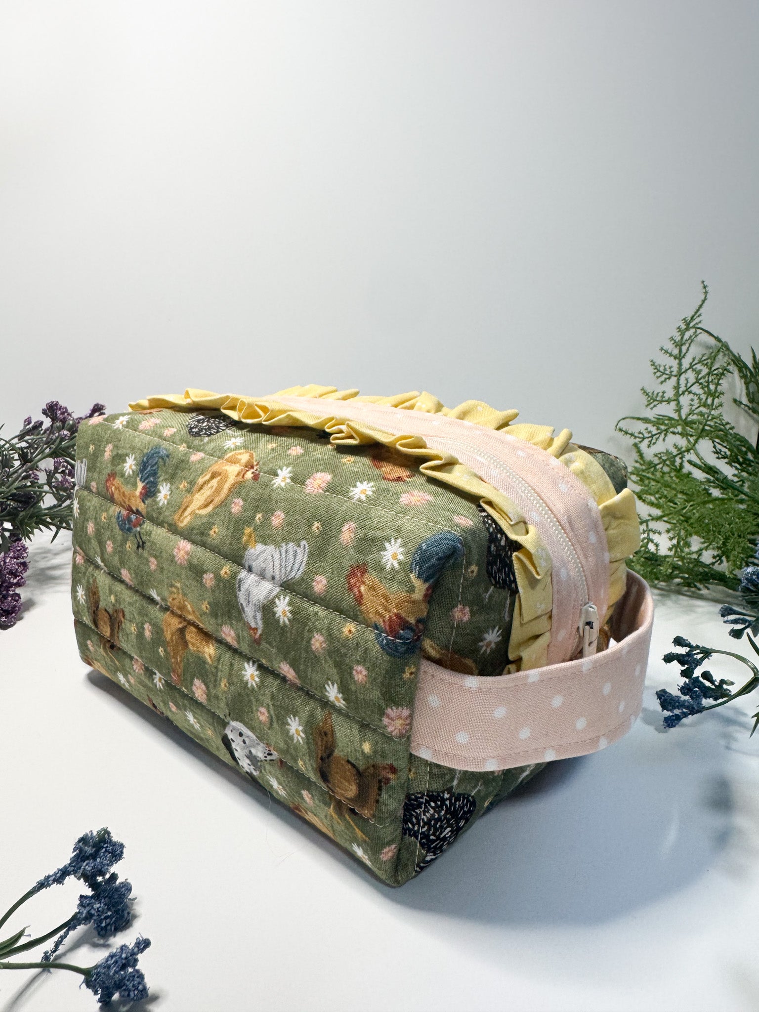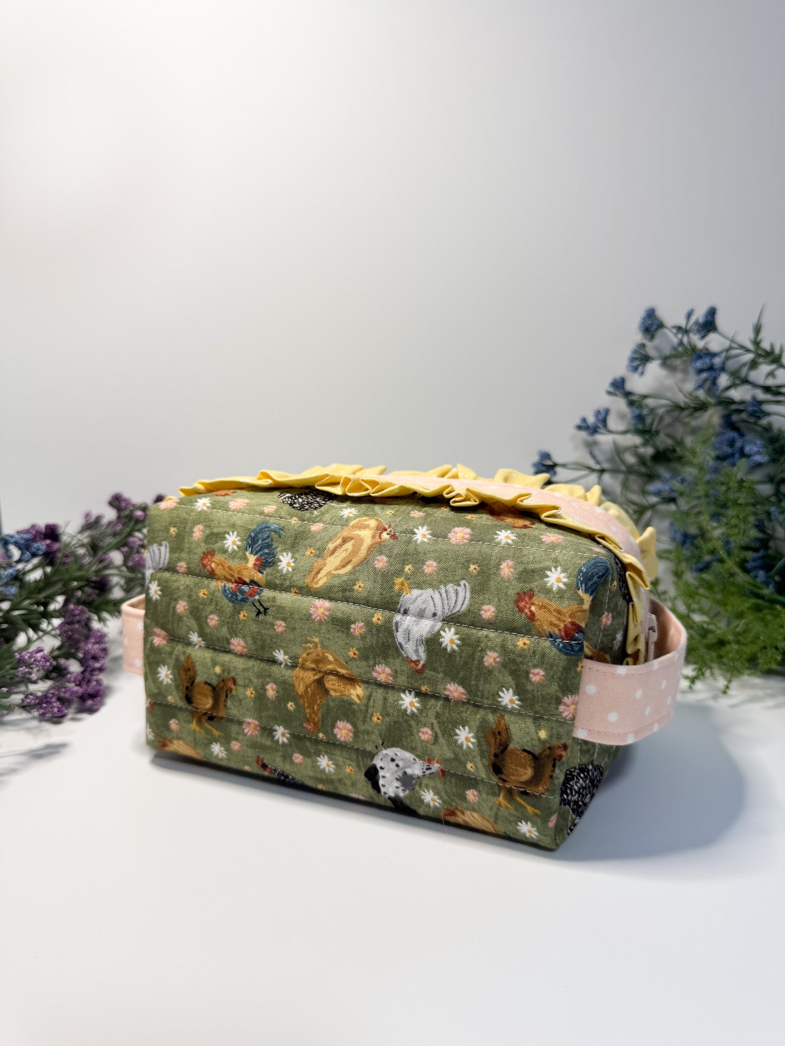 This small boxy pouch features a charming chicken print with yellow and pink accents, combining practical storage with a playful design. Its compact shape makes it ideal for organizing essentials like cosmetics, stationery, or small accessories, while the sturdy construction ensures durability. Perfect for those who appreciate functional yet distinctive accessories.